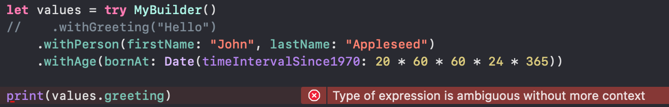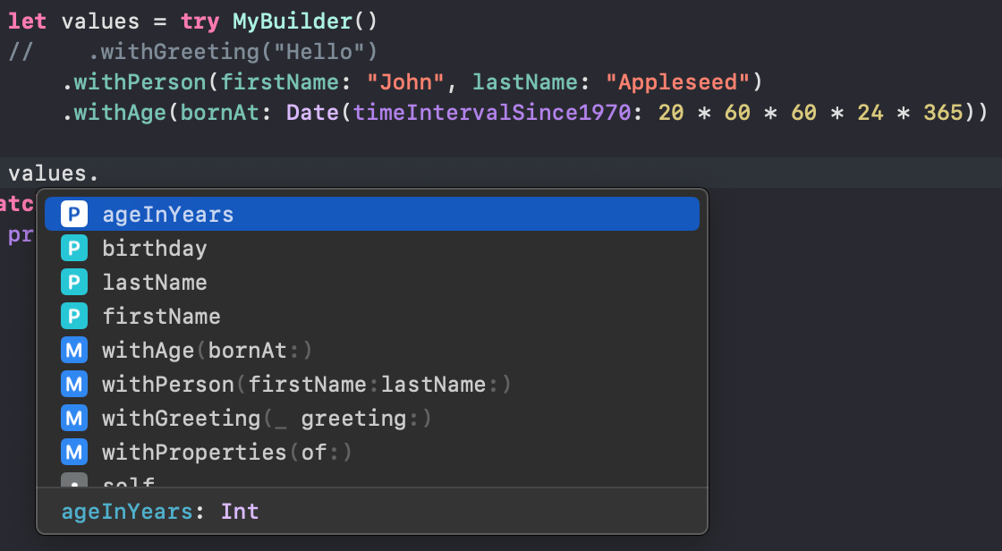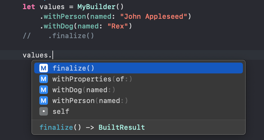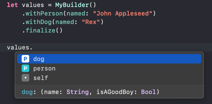 print(values.dog.isAGoodBoy) // Prints "true"Notice how only builder functions can be accessed without the finalize call: